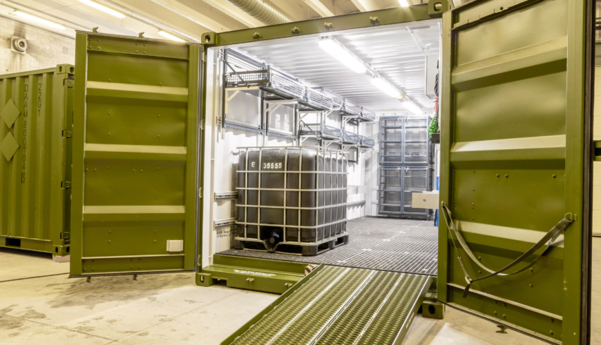 1in1 10ft container for environmental waste and hazmat Container with the ability to store all kinds of spillage products as oils, acids, bases etc. The container is equiped with the floor tray and drainage to the draining draining barrels.