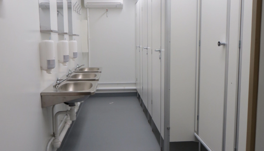 The container has five toilet cabins with 100L boiler and all equpment needed for hygiene. The climet unit and electrical heater ensure a good indoor climate at an outer temperature of -25C. For operate cantainer need external water and electricity supply.